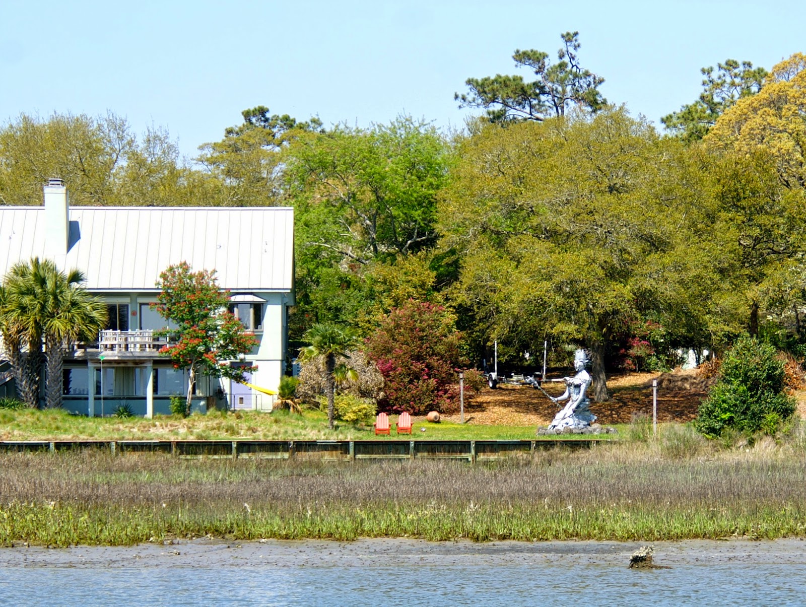 gorgeous homes - one that can only be described as garish, and one with yard art that left us puzzled - all part of the Emerald Coast. We reached Town Creek Marina in Beaufort (http://tinyurl.com/ksys2dx) by early afternoon. The gentle breeze Friday morning had become a strong wind by afternoon, and we were glad to be tied at the dock.